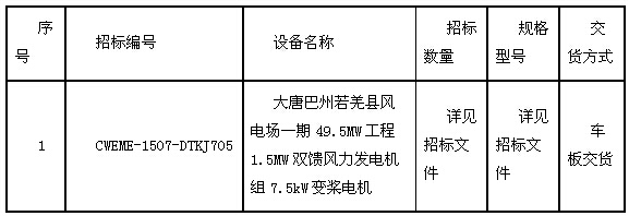 根据《中华人民共和国招标投标法》以及有关法律法规,遵循公开、公平、公正和诚实信用的原则,北京国电工程招标有限公司受大唐科技产业集团有限公司沈阳华创风能有限公司的委托,就该项目的大唐巴州若羌县风电场一期49.5MW工程1.5MW双馈风力发电机组7.5kW变桨电机(详细范围如下)进行国内公开招标,欢迎符合资质的单位前来参加投标。
