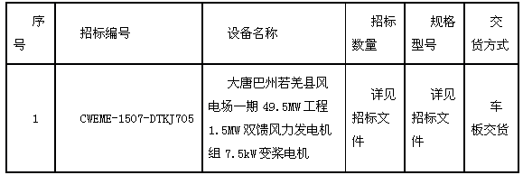 大唐巴州若羌县风电场一期49.5MW工程1.5MW双馈风力发电机组7.5kW变桨电机招标。