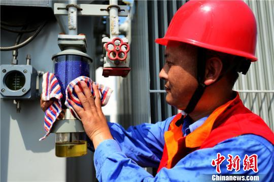 图为舟山电力安装工人在嵊泗东绿华岛风电场变电站内擦试设备。 姚峰 摄