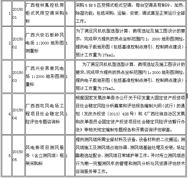 注:1、计划工期:(1) 广西桂林集控机房柜式民用空调采购标为2015年9月25日前完成;(2)广西兴安石板岭风电场1:2000地形图测量项目拟定于2015年10月30日之前完成;(3)广西兴安界首风电场1:2000地形图测量项目拟定于2015年10月30日之前完成;(4)广西西坑风电场工程项目社会稳定风险评估专题咨询标拟定于2015年10月10日之前完成;(5)风电新项目测风服务(含立测风塔)框架采购标拟定于2015年9月25日之前开始施实施。
