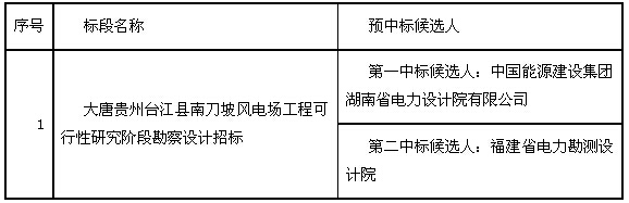 大唐贵州台江县南刀坡风电场工程可行性研究阶段勘察设计招标中标公示