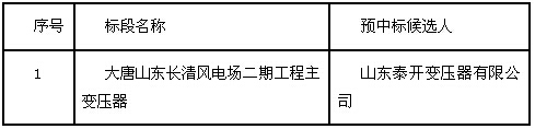 大唐山东长清风电场二期工程主变压器中标结果公示