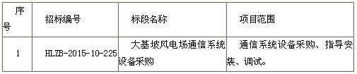 云南鸿立招标代理有限公司受招标人中国电力投资集团公司云南分公司委托,对昆明中云电新能源有限责任公司投资建设的云南省昆明市大基坡风电场通信系统设备采购[招标编号:HLZB-2015-10-225]进行公开招标,请符合资格要求的潜在投标人参加投标。