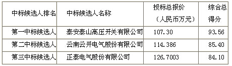 中航新能源湛江雷州调风风电场项目GIS设备采购[招标项目编号:ZTC-G15H-115]的招标评标工作已经完成,评标委员会向招标人推荐了本次招标的中标候选人名单。 按规定现将中标候选人情况予以公示, (公示时间从2015-11-03 00:00 至 2015-11-05 23:59止),具体如下: