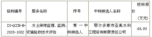 根据招标投标有关法律、法规的规定,招标编号为ZS-QCCH-H-2015-1002的评标工作已经结束,中标候选人已经确定。现将本次招标的中标结果公示如下: