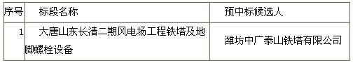 大唐山东长清二期风电场工程铁塔及地脚螺栓设备招标中标结果公示