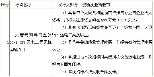 大唐云南寻甸金源33×1.5MW风电工程风机运输项目的招标人和发包人为国电联合动力技术有限公司。本招标项目的建设资金由发包人自筹,目前资金已落实。国电诚信招标有限公司作为招标代理人,现就大唐云南寻甸金源33×1.5MW风电工程风机运输项目进行公开招标,请有意且符合本公告规定资格条件的国内潜在投标人对本招标项目进行密封投标。