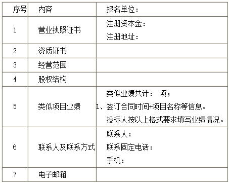 报名表后附:企业营业执照、资质证书、安全生产许可证、法定代表人授权委托书、授权代理人身份证、业绩合同等相关资料的扫描件。