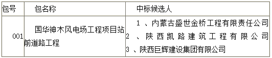 中国神华国际工程有限公司,就国华神木风电场工程项目站前道路工程进行公开招标,按规定程序进行了评标、定标,现就本次招标的中标候选人公示如下: