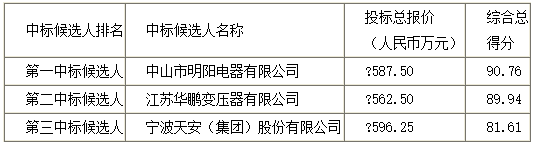 中航新能源湛江雷州调风风电场项目35kV紧凑型欧式箱式变电站设备采购[招标项目编号:ZTC-G15H-138]的招标评标工作已经完成,评标委员会向招标人推荐了本次招标的中标候选人名单。 按规定现将中标候选人情况予以公示, (公示时间从2015-12-16 00:00 至 2015-12-18 23:59止),具体如下: