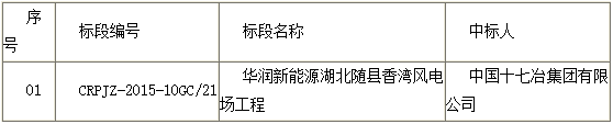 华润电力2015年度第十批次集中招标(新能源-随县香湾风电场工程)招标招标结果公告