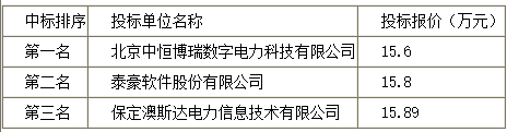 江西大唐国际永修风电有限责任公司2015年风场继电保护故障分析整定管理及仿真系统工程项目招标,于2015年 12月18日上午10:00时在江西省南昌市红谷滩新区碟子湖大道555号时间广场A座1809室进行招标开标会,现将本工程中标排序前三名的投标人公示如下: