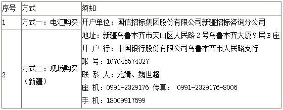 请按招标代理机构账号信息汇款,汇款单上应注明汇款用途、所购招标文件编号,然后将汇款单(扫描件)、下述表格信息以及授权委托书(扫描件)和被授权人身份证(扫描件)发送邮件:gxxj_wsc@163.com,并须同时电话通知联系人尤婧(电话:18009917599、传真:0991-2329176-8006)。招标代理机构在收到上述文件后,将电子版招标文件发到投标人提供的电子邮箱中,并将电话通知。