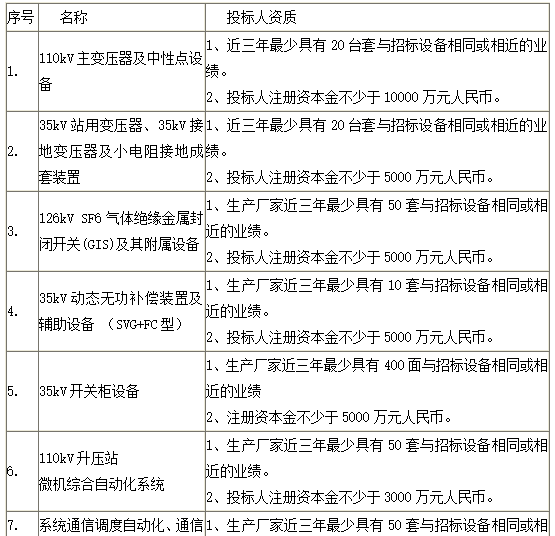 35kV铠装移开式交流金属封闭开关柜设备13面、35kV共箱母线及母线桥18米、35kV穿墙套管3支、双向多功能电能表11块、开关状态智能操显装置13台、专用设备及工具1套、备品备件1套。 |