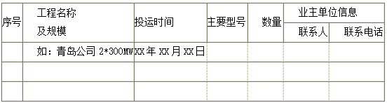 3、投标产品的生产企业具有设计、制造与招标设备相同/相近设备的能力,提供的业绩必须是真实的,如发现虚假业绩,将取消其投标资格,且业绩格式要符合下表的要求(可增加栏目),否则视为无效业绩。
