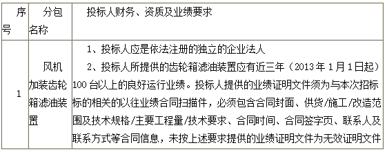 1.4 招标范围为国电电力巴彦淖尔(乌拉特后旗)分公司乌力吉风电场风机加装齿轮箱滤油装置的改造项目。本次招标包括该项目范围内所有改造前设计、设备制造、设备加工及材料供货、运输及检查、安装、服务等投标方面的技术要求。改造后的性能鉴定试验由投标方委托具有相应资质的第三方(招标方认可)负责实施,招标方可同时负责配合监督。具体内容详见招标文件第二卷的有关规定。