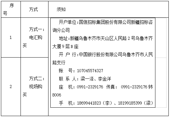 请按招标代理机构账号信息汇款,汇款单上应注明汇款用途、所购招标文件编号,否则,因款项用途不明导致投标无效等后果由投标人自行承担,然后将汇款单(扫描件)、下述表格信息以及授权委托书(扫描件)和被授权人身份证(扫描件)发送邮件:gxxj_lyz@163.com和guoxinbabu02@163.com,并须同时电话通知联系人梁一泽(电话:18199185399)。招标代理机构在收到上述文件后,将电子版招标文件发到投标人提供的电子邮箱中,并将电话通知。