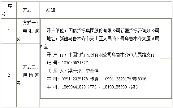 7.购买招标文件地点:国信招标集团股份有限公司新疆招标咨询分公司(乌鲁木齐市天山区人民路2号乌鲁木齐大厦9层B座);或:北京市海淀区车公庄西路19号外文文化创意园12B。