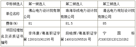 清远110千伏佛冈福鑫风电场接入系统工程、110千伏连州福山风电场接入系统工程[可研-勘察设计][项目编号:JG2015-8420]项目的招标评标工作已经结束,评标委员会经评审推荐了本项目中标候选人。 现将中标候选人情况予以公示(公示时间从2016-01-08 17:31 至 2016-01-11 23:59止),具体如下: