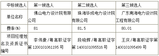 110千伏中广核清远英德黄花镇风电场接入系统工程[可研-勘察设计][项目编号:JG2015-8418]项目的招标评标工作已经结束,评标委员会经评审推荐了本项目中标候选人。 现将中标候选人情况予以公示(公示时间从2016-01-08 17:28 至 2016-01-11 23:59止),具体如下: