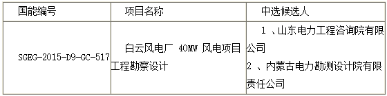 中国神华国际工程有限公司,就白云风电厂 40MW 风电项目工程勘察设计进行竞争性谈判,按规定程序进行了评标、定标,现就本次招标的中标候选人公示如下:
