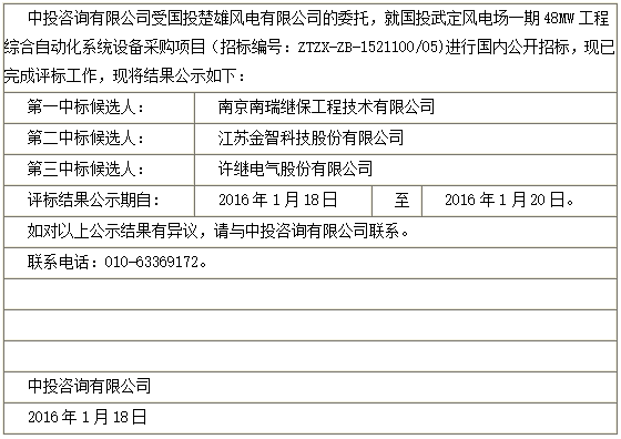 国投武定风电场一期48MW工程综合自动化系统设备采购项目中标候选人公示
