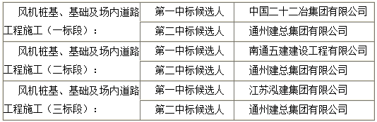 江苏省国际招标公司受用户委托,对江苏国信东台弶港农场风电场风机桩基、基础及场内道路工程施工进行国内公开招标,评标、定标工作已经结束,现将中标结果公示如下: