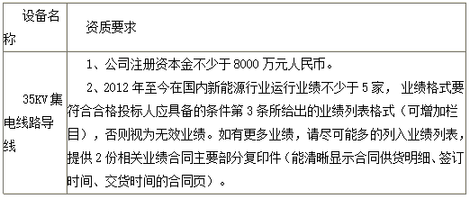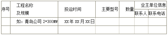 3、投标产品的生产企业具有设计、制造与招标设备相同/相近设备的能力,提供的业绩必须是真实的,如发现虚假业绩,将取消其投标资格,且业绩格式要符合下表的要求(可增加栏目),否则视为无效业绩。