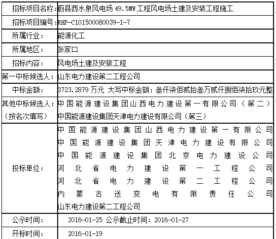 蔚县西水泉风电场49.5MW工程风电场土建及安装工程施工中标公示
