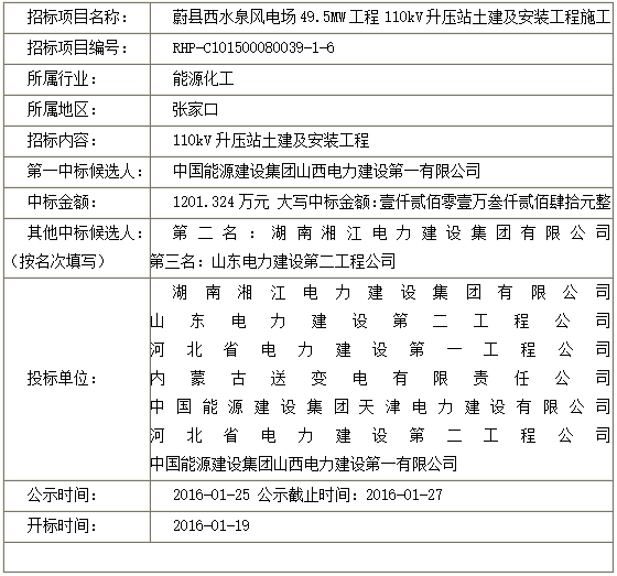 蔚县西水泉风电场49.5MW工程110kV升压站土建及安装工程施工中标公示