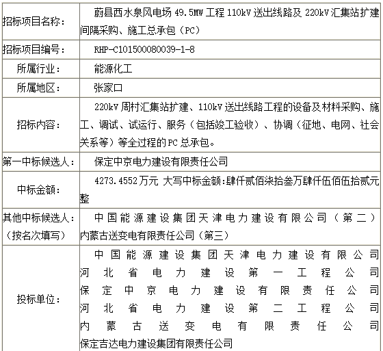 蔚县西水泉风电场49.5MW工程110kV送出线路及220kV汇集站扩建间隔采购、施工总承包(PC)招标中标公示