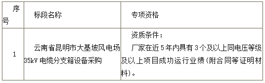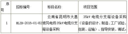 云南鸿立招标代理有限公司受招标人中国电力投资集团公司云南分公司委托,对昆明中云电新能源有限责任公司投资建设的云南省昆明市大基坡风电场35kV电缆分支箱设备采购[招标编号:HLZB-2016-01-82]进行公开招标,请符合资格要求的潜在投标人参加投标。