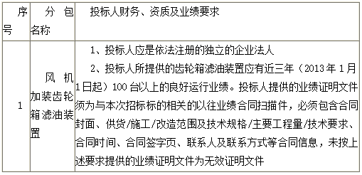 1.4 招标范围为国电电力巴彦淖尔(乌拉特后旗)分公司乌力吉风电场风机加装齿轮箱滤油装置的改造项目。本次招标包括该项目范围内所有改造前设计、设备制造、设备加工及材料供货、运输及检查、安装、服务等投标方面的技术要求。改造后的性能鉴定试验由投标方委托具有相应资质的第三方(招标方认可)负责实施,招标方可同时负责配合监督。具体内容详见招标文件第二卷的有关规定。