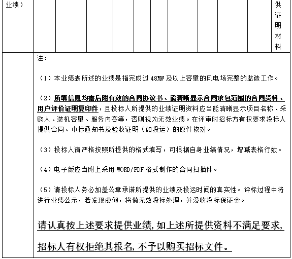 (1)投标人应至少从事48MW及以上容量的风电场监造2年以上的时间,至少完成过48MW及以上容量的风电场完整的监造工作。