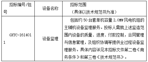 1、国信招标集团股份有限公司(以下简称“招标代理机构”)受内蒙古粤电蒙华新能源有限责任公司(以下简称“招标人”或“买方”)委托,就内蒙古粤电蒙华包头白云鄂博风电供热项目风电场工程主机和主要辅机设备监理服务进行 公开招标 ,现邀请有投标意愿的潜在投标人(以下简称投标人)按照本公告的要求提出报名申请。