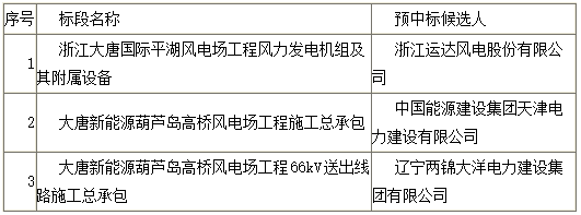浙江大唐国际平湖风电场工程风力发电机组及其附属设备、大唐新能源葫芦岛高桥风电场工程施工总承包、66kV送出线路施工总承包招标结果公示