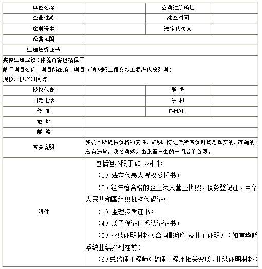 4.2 有意向的投标人可从2016年1月29日9:00起至2016年2月6日17:00止,登陆华能招标有限公司网站(http://www.chnzb.cn)上传报名文件(含报名表、企业营业执照、组织机构代码证、税务登记证、法定代表人授权委托书、授权代理人身份证、资质证书、体系认证、总监资质证书、业绩合同等相关资料的扫描件,制作成一个WORD文件);经招标代理机构审核合格后,投标人购买并下载招标文件。不接受传真,不接待来访。不按要求上传报名文件的,其申请为无效申请;上传三次报名文件仍不合格者,其申请有在报名有效期内审核被冻结的风险,由于上传次数过多,导致报名失效的后果由投标人自行承担。