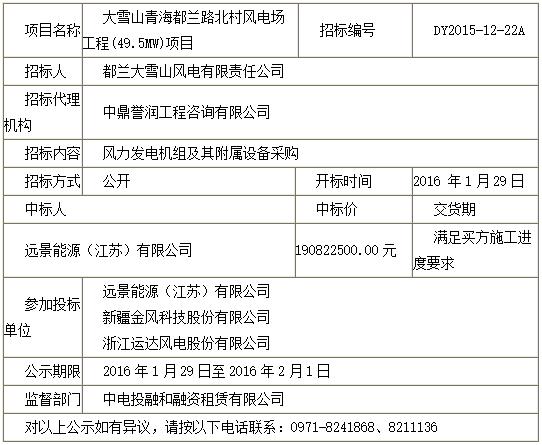 大雪山青海都兰路北村风电场工程(49.5MW)项目风力发电机组及其附属设备采购中标人公示