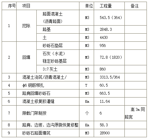 本次招标项目需要对水泥硬化路面21.7公里、沥青路面8.6公里、砂砾路面28.0公里等乡村道路进行恢复,主要工程量见下表,具体恢复方案详见招标文件。