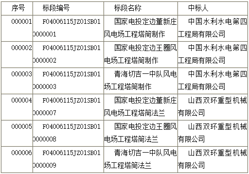 中国电力投资集团公司物资装备分公司2015年第九批风电塔筒集中招标(董新庄、王圈、切吉一中队项目塔筒、法兰)通过招标评审,结果如下: