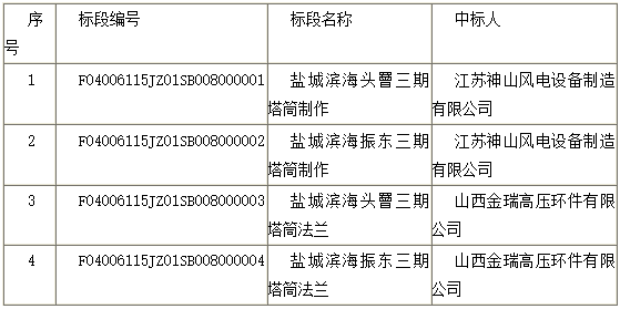 中国电力投资集团公司物资装备分公司2015年第七批风电塔筒集中招标(盐城滨海头罾、振东塔筒、法兰)通过招标评审,结果公示如下: