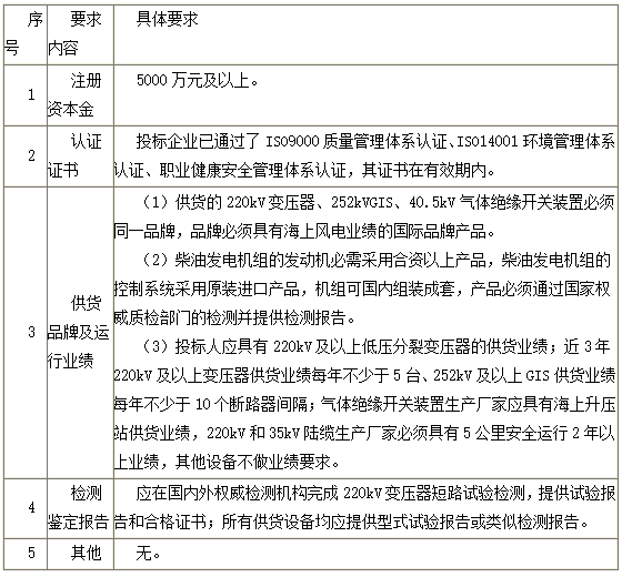 本技术文件招标范围包括海上升压站内的220kV电力变压器及其附属设备、252kVGIS及其附属设备、40.5kV SF6气体绝缘开关柜、接地变兼站用变压器、接地变压器和小电阻设备、柴油发电机组及其附属设备、低压盘柜设备、高压电缆(220kV及35kV)及其附属设备,陆上集控中心的252kVGIS及其附属设备和220kV降压变压器及其附属设备,及其他为保证设备正常运行所必需的装置的设计、制造、试验、包装、运输、交货、提供工厂图纸及资料,以及现场安装调试和运输的技术服务等工作。