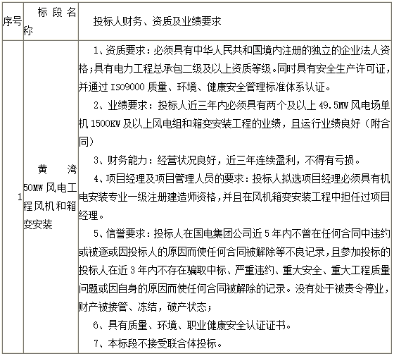 塔筒、机舱、轮毂、叶片以及配套的设备部件的到货二次检验检测、卸车、保管、二次搬运; 吊装设备运输、进出场、机械设备站位、场内拆卸及转移; 塔筒、机舱、轮毂、叶片以及配套的设备部件等的现场组装、安装、移交前的安全保卫; 塔筒内部电气动力、控制线缆敷设及接头制作连接安装,接地系统连接,电气设备(含控制电缆光缆等)安装、试验、调试等; 箱式变电站及配套设备部件的到货卸车、保管、二次搬运; 箱式变电站的现场组装、安装(包含接地系统),配合调试、并网试运行; 塔内底部设备安装以及电缆的连接,箱变至风机的电缆沟开挖、回填、电缆敷设、电缆连接,电缆、光缆敷设采用穿管加直埋方式,埋深1.5米;电缆接线端子加工制作及电缆交接试验,光缆敷设,风机的清理等;电缆防火采用柔性有机堵料(防火泥)封堵并对封堵处1.5米以内电缆涂刷防火涂料;箱变至风机低压电缆长度约为45米,规格为[6×(3×240)+3×240]mm2电缆(即每组6根3×240,另加3根PEN)。 塔筒、箱变各类电缆光缆标识牌加工、制作、悬挂,标识牌材料为304不锈钢,字体为阴文雕刻或激光打印,字体颜色为黑色,钢丝绑挂。 其他施工辅助工程(含永久设备及照明灯具、爬梯、免爬器等的卸货和安装)及风机和箱变相关联的零星安装工程; 风机配合调试、设备代保管、240小时并网试运行; 安全文明施工环境保护措施等; 备品备件及专用工具的卸货、代保管及最终运输至招标方的指定地点,备品备件及专用工具投标单位保管期间的使用必须办理招标方要求的相关手续。 除招标人提供的吊装场地、进场道路以外的临时占地由投标人自行解决。 为完成所承建工程,投标人负责与本标段有关各方的协调(如材料设备运输所遇到的村民阻工)工作,由此发生费用已含在合同内。招标人不负责施工期间阻工等协调工作。 招标人仅提供专用吊具(专用吊具清单见附件),不足吊具由投标人负责补充提供,其余所需安装工具由投标人提供。 投标人配合招标人接受陕西省质量监督站和中国电力建设企业协会对本工程进行质量监督检查和工程达标创优检查工作。 本工程拟创建中国电力行业优质工程奖,投标人应按照招标人提供的《黄湾、盛梁2×50MW风电工程达标创优策划方案》、《黄湾、盛梁2×50MW风电工程安全文明施工策划方案》、《中国国电集团公司工程建设安全健康环境管理办法》、《中国国电集团安全设施·标志·标识标准化图册》(见附件)要求及国家相关规定要求,对本工程进行工程创优及创建安全文明工地。
