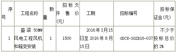 本招标项目国电定边新能源有限公司盛梁50MW风电工程风机和箱变基础施工招标已由陕西省发展和改革委员会《关于国电陕西新能源公司定边盛梁风电场工程项目核准的批复》【文号:陕发改新能源(2013)1897号】批准建设,项目公司为国电定边新能源有限公司,建设资金来自自筹及融资,项目出资比例为100%,招标人为国电定边新能源有限公司。项目已具备招标条件,现对该项目的风机和箱变安装进行公开招标。