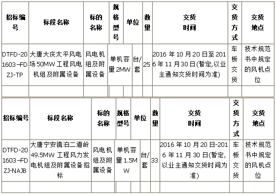 1.1 工程名称:中国大唐集团公司2016年招标的各风电场工程,详见下表