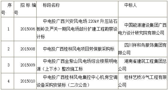 中电投广西兴安风电场220kV升压站石板岭及严关一期风电场部分扩建工程勘察设计标、中电投广西桂林风电项目劳保服采购标、中电投广西金紫山风电场综合楼照明电源(上下水)整改施工标、中电投广西桂林风电集控中心机房空调设备采购安装标(二次公告)招标通过招标评审,结果如下:
