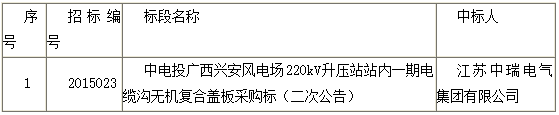 中电投广西兴安风电场220kV升压站站内一期电缆沟无机复合盖板采购标(二次公告)招标通过招标评审,结果如下: