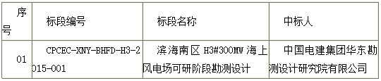 国家电投滨海南区H3#300MW海上风电场工程可研阶段勘测设计招标通过招标评审,结果如下:
