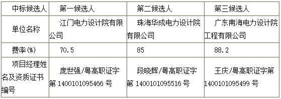 湛江110千伏龙门风电场接入系统工程[可研-勘察设计][项目编号:JG2016-0373]项目的招标评标工作已经结束,评标委员会经评审推荐了本项目中标候选人。 现将中标候选人情况予以公示(公示时间从2016-02-26 17:30 至 2016-02-29 23:59止),具体如下: