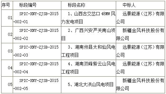 国家电力投资集团公司二〇一五年度第二十一批集中招标(第二批风力发电机组设备-山地风电带方案招标)通过招标评审,结果如下: